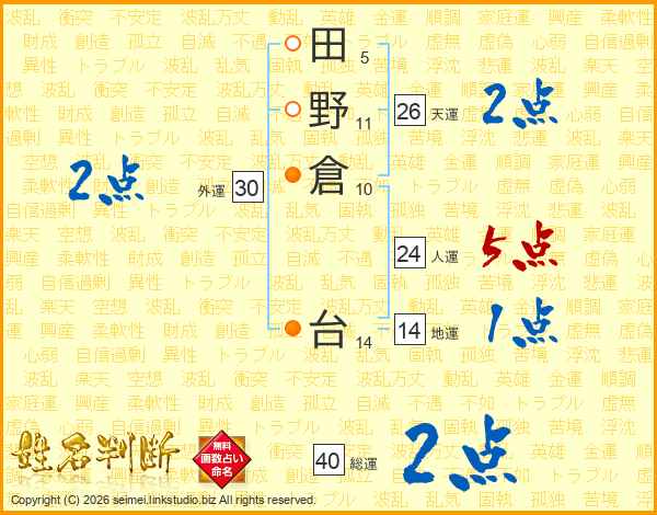 生活面を象徴する運勢です。外部から受ける影響力を表し、結婚運、家庭運や職場、環境への順応性を表します。総運から人運を引いた画数。姓や名が1文字の場合を除く。