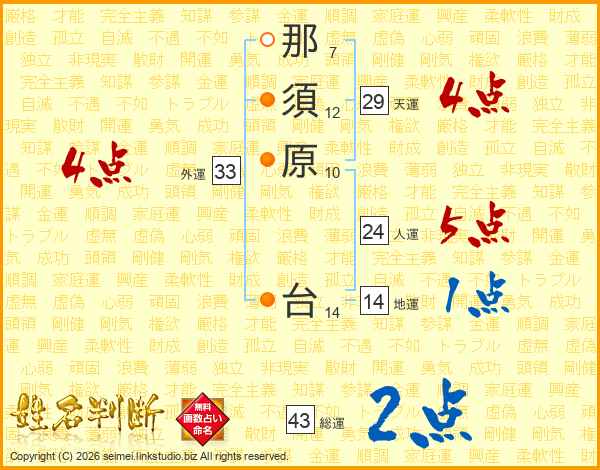 生活面を象徴する運勢です。外部から受ける影響力を表し、結婚運、家庭運や職場、環境への順応性を表します。総運から人運を引いた画数。姓や名が1文字の場合を除く。