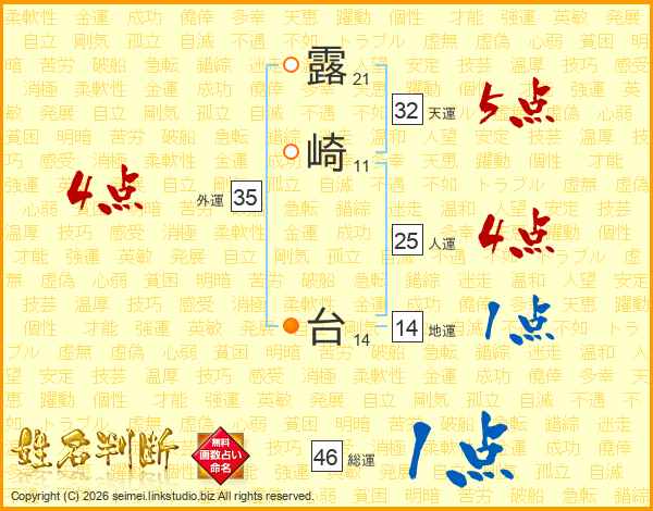 生活面を象徴する運勢です。外部から受ける影響力を表し、結婚運、家庭運や職場、環境への順応性を表します。総運から人運を引いた画数。姓や名が1文字の場合を除く。