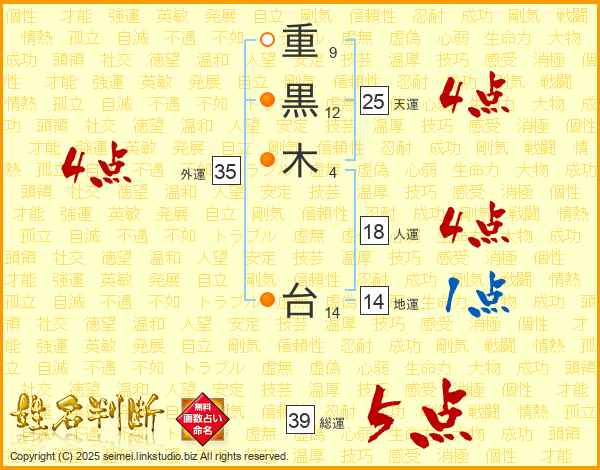 あなたの人生を表す1番重要な運勢です。生涯を通じて影響する総合運となり、主に50歳以降の晩年期に影響を及ぼします。苗字と名前の合計画数。