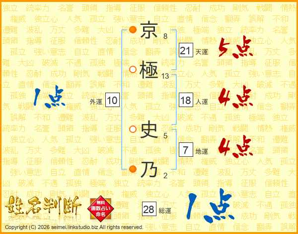 あなたの人生を表す1番重要な運勢です。生涯を通じて影響する総合運となり、主に50歳以降の晩年期に影響を及ぼします。苗字と名前の合計画数。