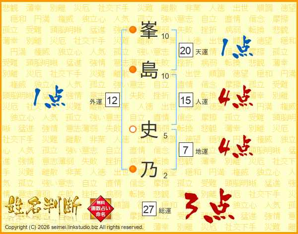 峯(10画)島(10画) 史(5画)乃(2画)