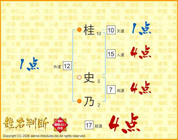 生活面を象徴する運勢です。外部から受ける影響力を表し、結婚運、家庭運や職場、環境への順応性を表します。総運から人運を引いた画数。姓や名が1文字の場合を除く。