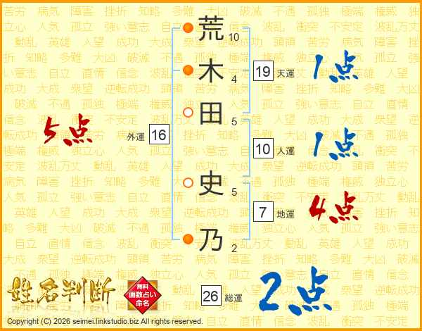 荒(10画)木(4画)田(5画) 史(5画)乃(2画)