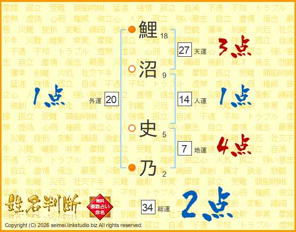 鯉(18画)沼(9画) 史(5画)乃(2画)