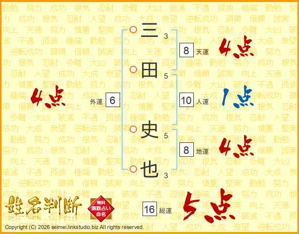 三田史也さんの総運は16画の5点!