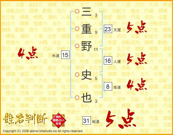 三(3画)重(9画)野(11画) 史(5画)也(3画)
