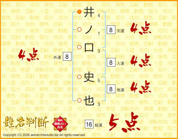 井(4画)ノ(1画)口(3画) 史(5画)也(3画)