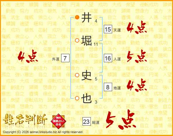 あなたの人生を表す1番重要な運勢です。生涯を通じて影響する総合運となり、主に50歳以降の晩年期に影響を及ぼします。苗字と名前の合計画数。