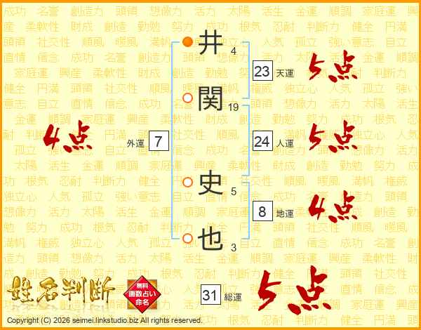 井(4画)関(19画) 史(5画)也(3画)
