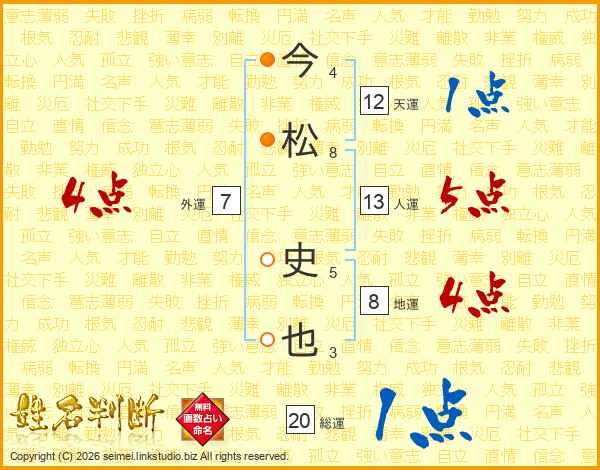 今(4画)松(8画) 史(5画)也(3画)
