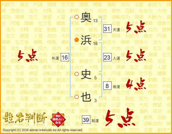 あなたの人生を表す1番重要な運勢です。生涯を通じて影響する総合運となり、主に50歳以降の晩年期に影響を及ぼします。苗字と名前の合計画数。