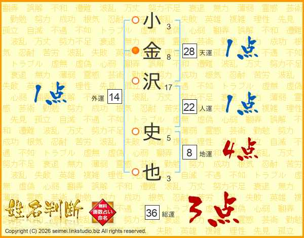 小(3画)金(8画)沢(17画) 史(5画)也(3画)