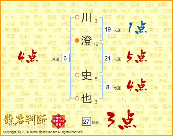 川(3画)澄(16画) 史(5画)也(3画)