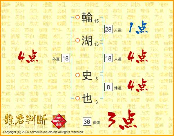 輪湖史也さんの総運は36画の3点!