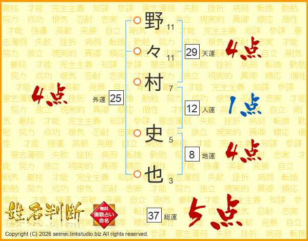野(11画)々(11画)村(7画) 史(5画)也(3画)