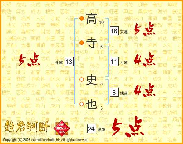 高(10画)寺(6画) 史(5画)也(3画)