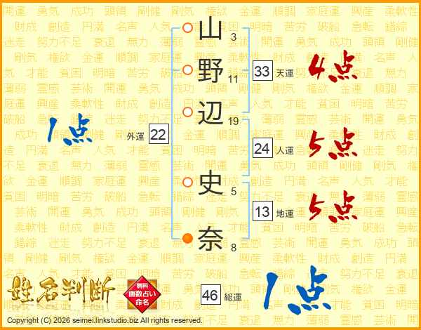 山(3画)野(11画)辺(19画) 史(5画)奈(8画)