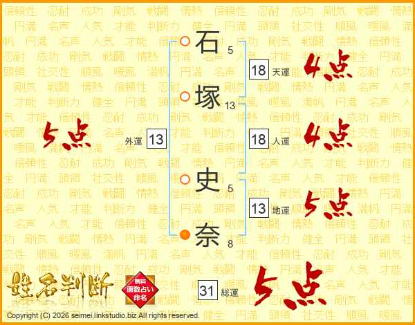 あなたの人生を表す1番重要な運勢です。生涯を通じて影響する総合運となり、主に50歳以降の晩年期に影響を及ぼします。苗字と名前の合計画数。