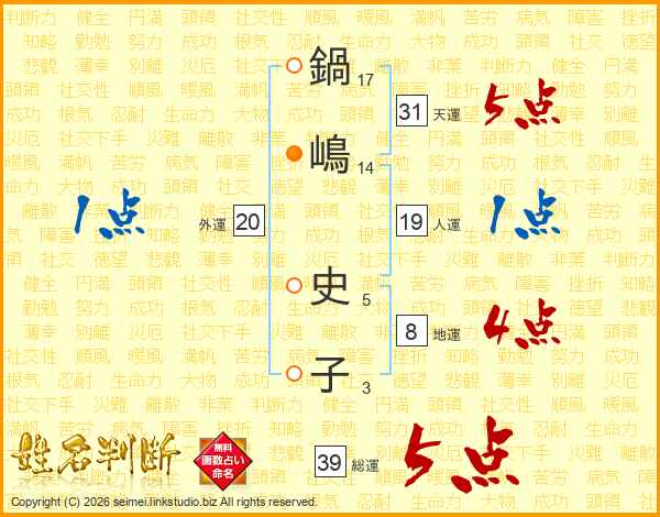 鍋(17画)嶋(14画) 史(5画)子(3画)