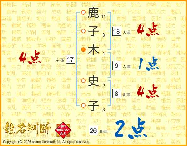鹿(11画)子(3画)木(4画) 史(5画)子(3画)