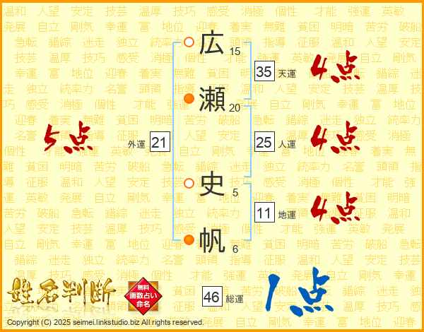 広(15画)瀬(20画) 史(5画)帆(6画)