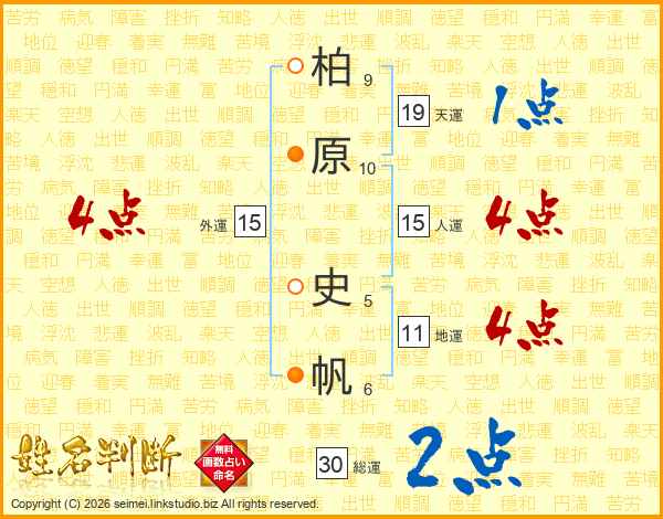 柏(9画)原(10画) 史(5画)帆(6画)