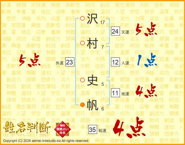 沢(17画)村(7画) 史(5画)帆(6画)
