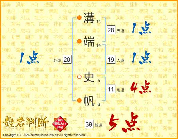生活面を象徴する運勢です。外部から受ける影響力を表し、結婚運、家庭運や職場、環境への順応性を表します。総運から人運を引いた画数。姓や名が1文字の場合を除く。