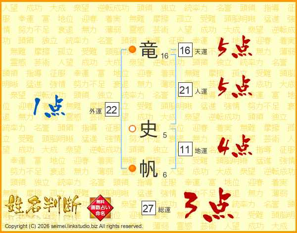 生活面を象徴する運勢です。外部から受ける影響力を表し、結婚運、家庭運や職場、環境への順応性を表します。総運から人運を引いた画数。姓や名が1文字の場合を除く。