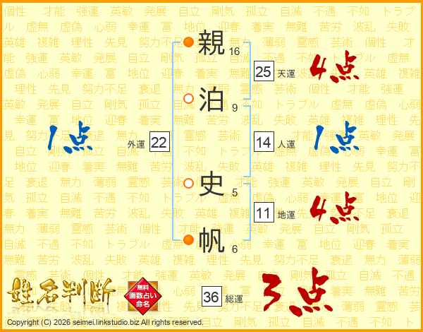 あなたの人生を表す1番重要な運勢です。生涯を通じて影響する総合運となり、主に50歳以降の晩年期に影響を及ぼします。苗字と名前の合計画数。