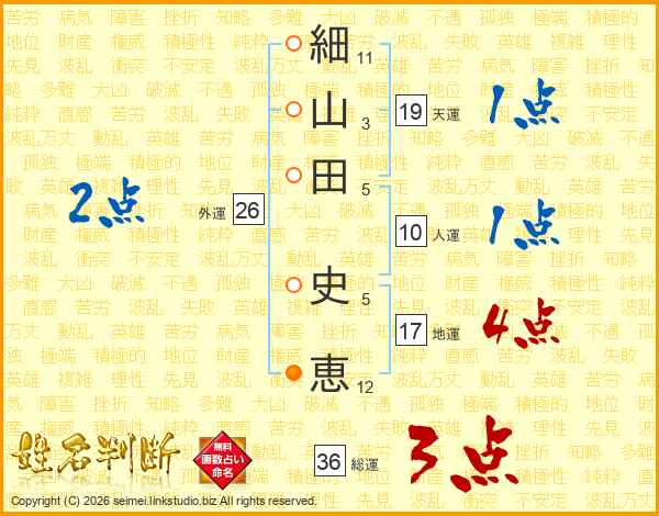 細(11画)山(3画)田(5画) 史(5画)恵(12画)