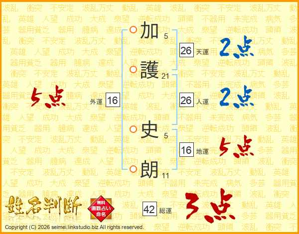 生活面を象徴する運勢です。外部から受ける影響力を表し、結婚運、家庭運や職場、環境への順応性を表します。総運から人運を引いた画数。姓や名が1文字の場合を除く。