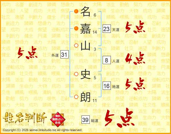 名(6画)嘉(14画)山(3画) 史(5画)朗(11画)