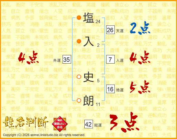 塩(24画)入(2画) 史(5画)朗(11画)