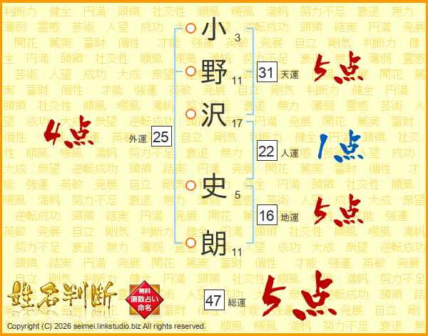 小(3画)野(11画)沢(17画) 史(5画)朗(11画)