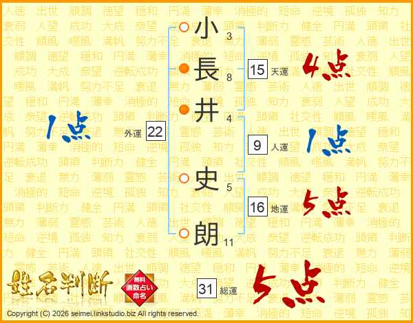 小(3画)長(8画)井(4画) 史(5画)朗(11画)
