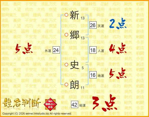 あなたの人生を表す1番重要な運勢です。生涯を通じて影響する総合運となり、主に50歳以降の晩年期に影響を及ぼします。苗字と名前の合計画数。