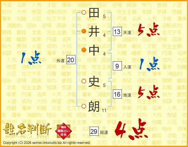 田(5画)井(4画)中(4画) 史(5画)朗(11画)