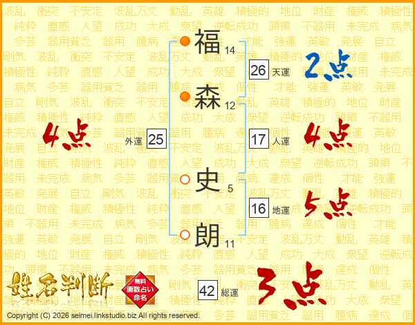 あなたの人生を表す1番重要な運勢です。生涯を通じて影響する総合運となり、主に50歳以降の晩年期に影響を及ぼします。苗字と名前の合計画数。