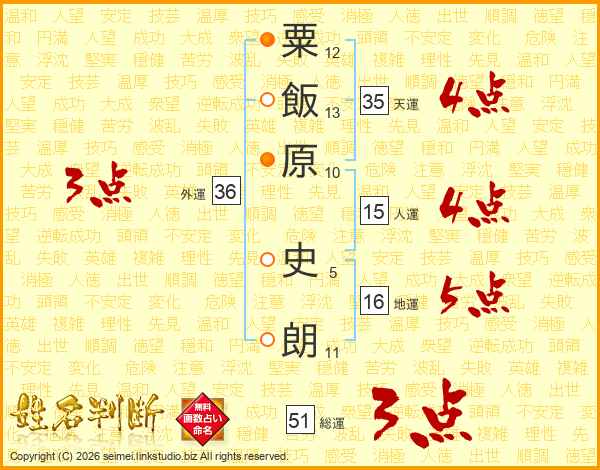 粟(12画)飯(13画)原(10画) 史(5画)朗(11画)