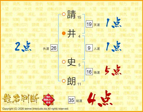 あなたの人生を表す1番重要な運勢です。生涯を通じて影響する総合運となり、主に50歳以降の晩年期に影響を及ぼします。苗字と名前の合計画数。