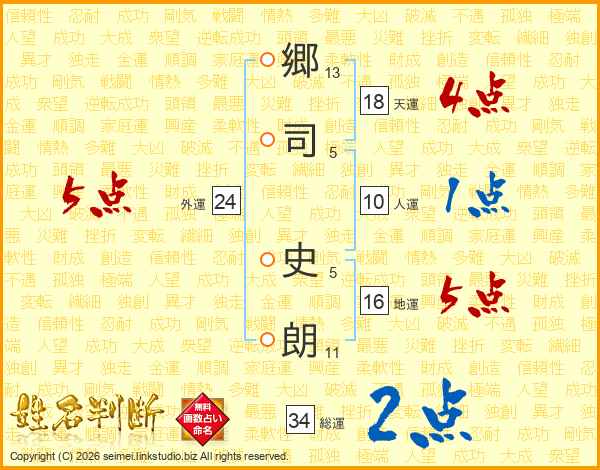郷(13画)司(5画) 史(5画)朗(11画)