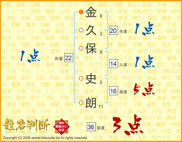 金(8画)久(3画)保(9画) 史(5画)朗(11画)