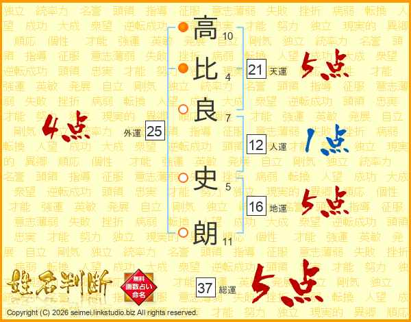 高(10画)比(4画)良(7画) 史(5画)朗(11画)