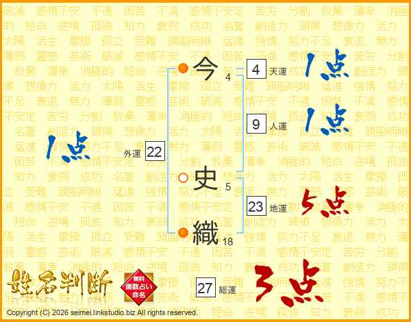 あなたの人生を表す1番重要な運勢です。生涯を通じて影響する総合運となり、主に50歳以降の晩年期に影響を及ぼします。苗字と名前の合計画数。
