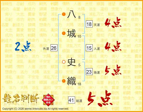 家系が持つ宿命的な運勢を表します。祖先から受け継いだ苗字ですので自分の力が及びません。家柄を象徴します。苗字の合計画数。