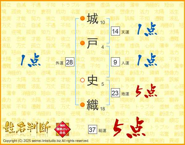 生活面を象徴する運勢です。外部から受ける影響力を表し、結婚運、家庭運や職場、環境への順応性を表します。総運から人運を引いた画数。姓や名が1文字の場合を除く。