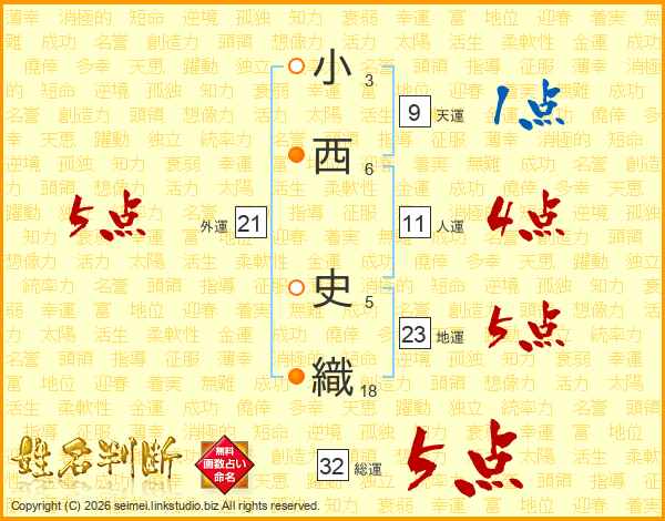 生活面を象徴する運勢です。外部から受ける影響力を表し、結婚運、家庭運や職場、環境への順応性を表します。総運から人運を引いた画数。姓や名が1文字の場合を除く。
