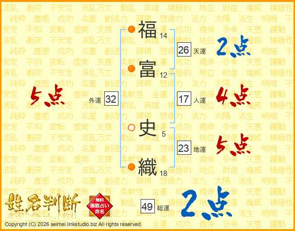 生活面を象徴する運勢です。外部から受ける影響力を表し、結婚運、家庭運や職場、環境への順応性を表します。総運から人運を引いた画数。姓や名が1文字の場合を除く。